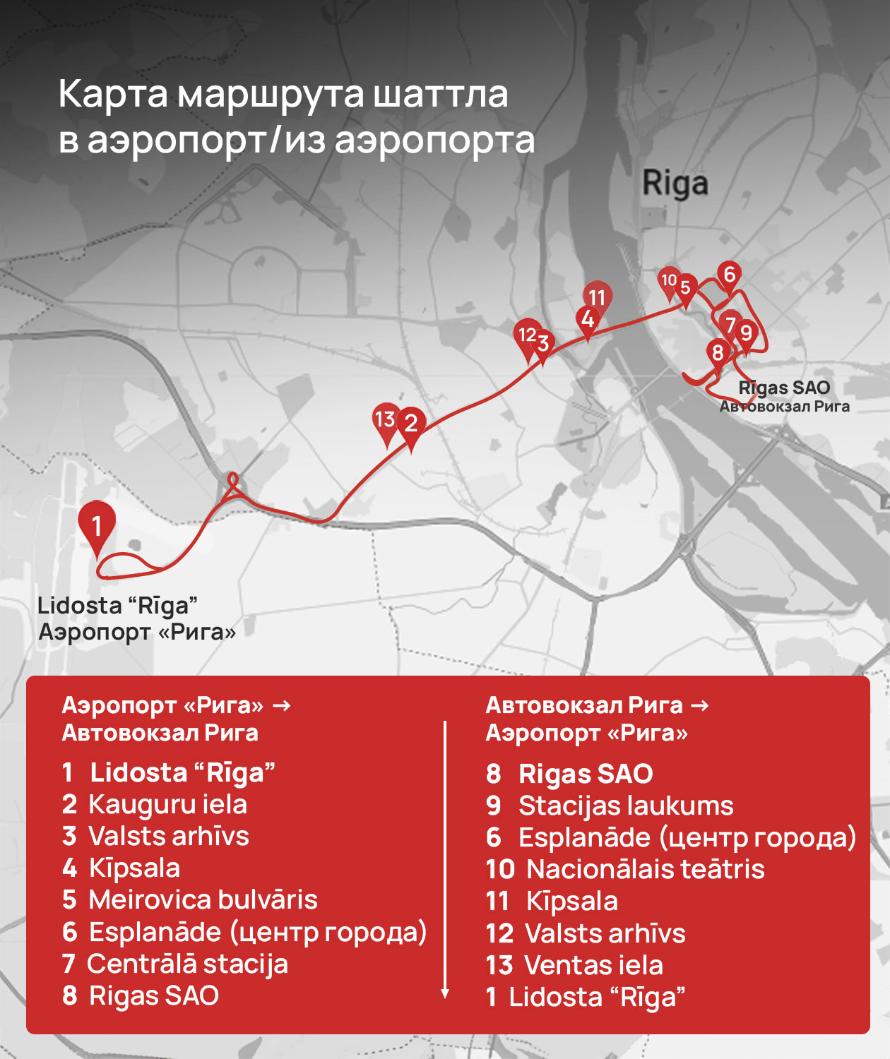 Поездка от центра до аэропорта Риги занимает около 25 минут (продолжительность может меняться в зависимости от трафика).